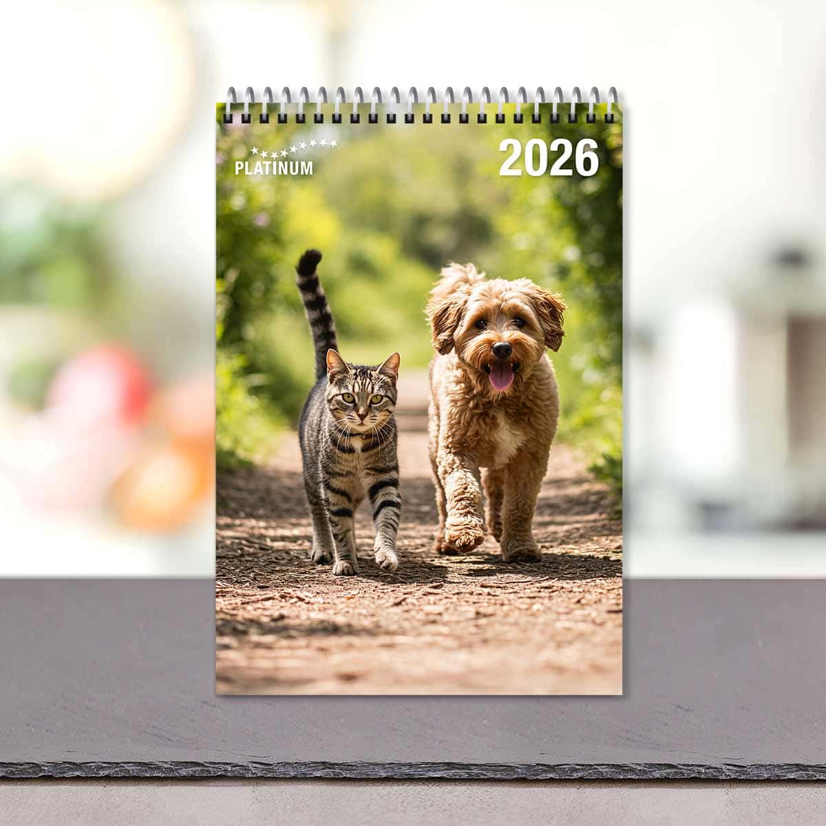 Koledar PLATINUM 2026 je stenski koledar za vse, ki imajo radi pse in mačke – vsak mesec te pričaka nova kosmata družba, ko planiraš sprehode, veterinarja in proste dni.