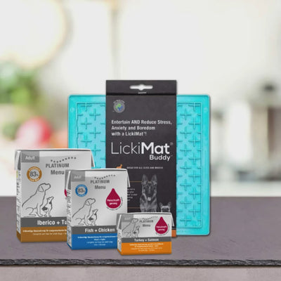 LickiMat® Buddy je podloga za lizanje, ki so jo razvili veterinarji in jo je mogoče odlično kombinirati z našo mokro hrano PLATINUM Menu. Prednosti podloge LickiMat so številne in prepričajo tudi izkušene trenerje in lastnike živali po vsem svetu. Koncept temelji na dajanju izzivov psu z ustreznimi nagradami v obliki hrane ali priboljškov. Na ta način je pes zaposlen dlje časa, hrano pa lahko zaužije v majhnih porcijah.